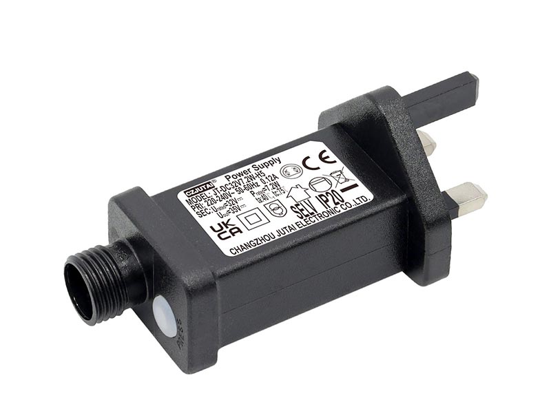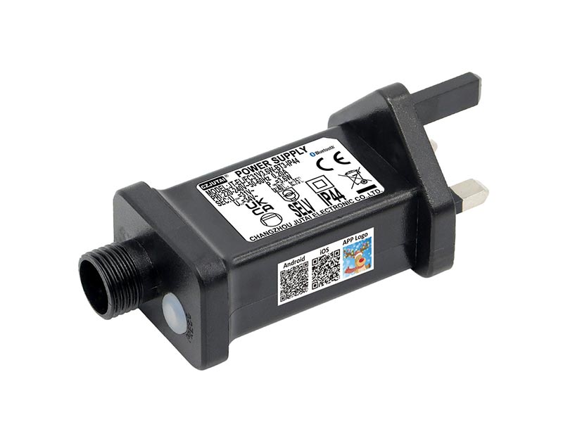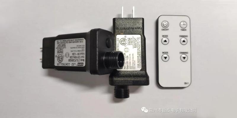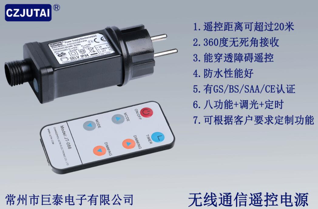 巨泰美规红外遥控一体式变压器,内置多功能控制(八功能、定时、调光、无极双色泡控制、RGB控制等功能),插上灯串直接可用,省去焊接独立控制器的工序,更加方便您的生产和出货。